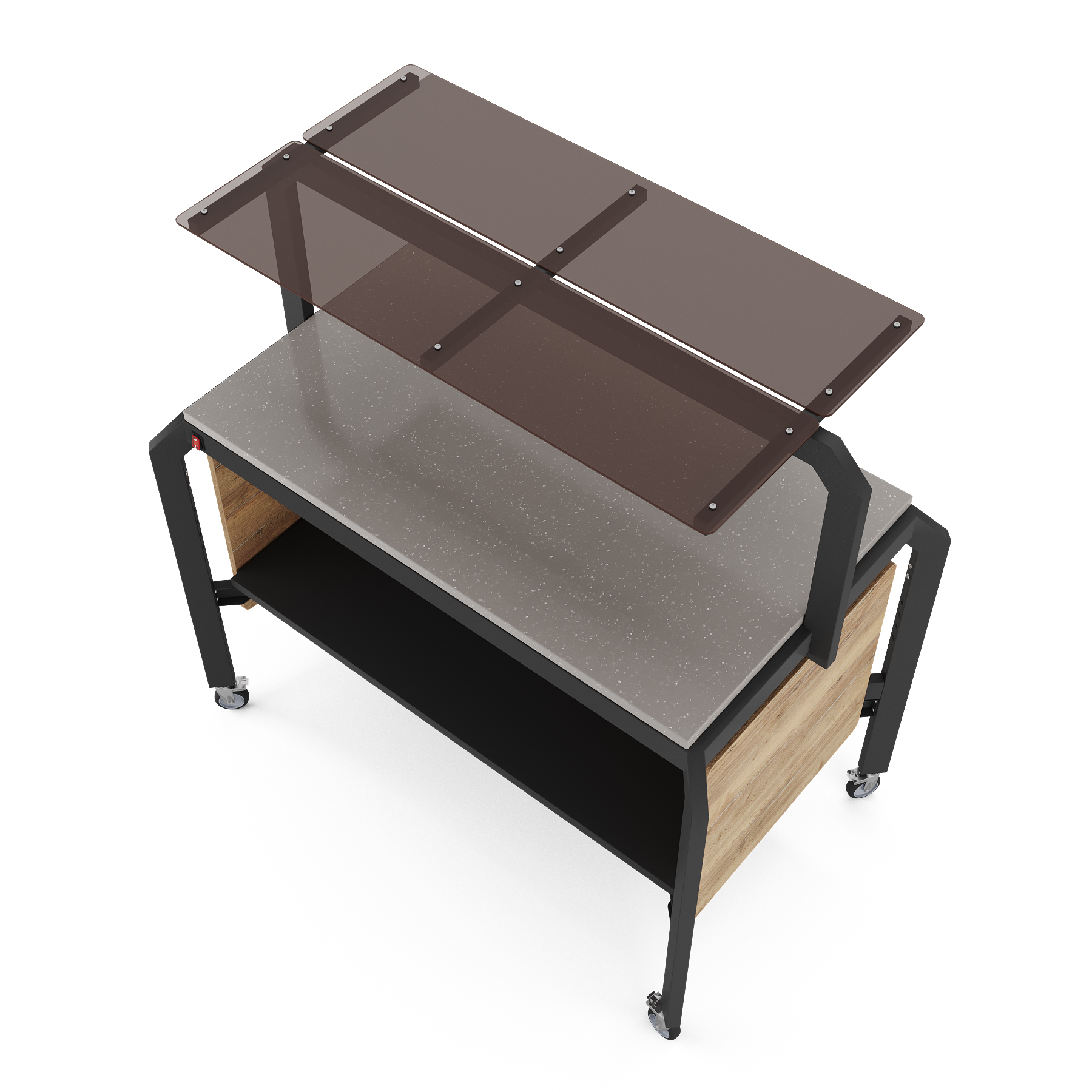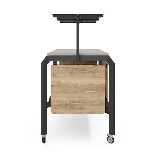 Модуль мобильный нейтральный КОБОР AN150 black/olovo/sky предназначен для демонстрации, кратковременного хранения и раздачи готовых блюд: салатов, закусок, кондитерских изделий и напитков, и чистых тарелок в составе линий раздачи или самообслуживания в кафе, ресторанах и фудкортах, на предприятиях общественного питания и торговли. Модель оснащена полкой-надстройкой со стеклом и поворотными колесами для мобильности, 2 колеса оснащены тормозом. Сварной каркас выполнен из профиля сечением 60х30, покрытого порошковой краской, внешний корпус - из ЛДСП, столешница - из камня.