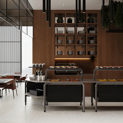 Модуль мобильный нейтральный КОБОР AN220 aluminum/glazed/sky предназначен для демонстрации, кратковременного хранения и раздачи готовых блюд: салатов, закусок, кондитерских изделий и напитков, и чистых тарелок в составе линий раздачи или самообслуживания в кафе, ресторанах и фудкортах, на предприятиях общественного питания и торговли. Модель оснащена полкой-надстройкой со стеклом и поворотными колесами для мобильности, 2 колеса оснащены тормозом. Сварной каркас выполнен из профиля сечением 60х30, покрытого порошковой краской, внешний корпус - из ЛДСП, столешница - из камня.