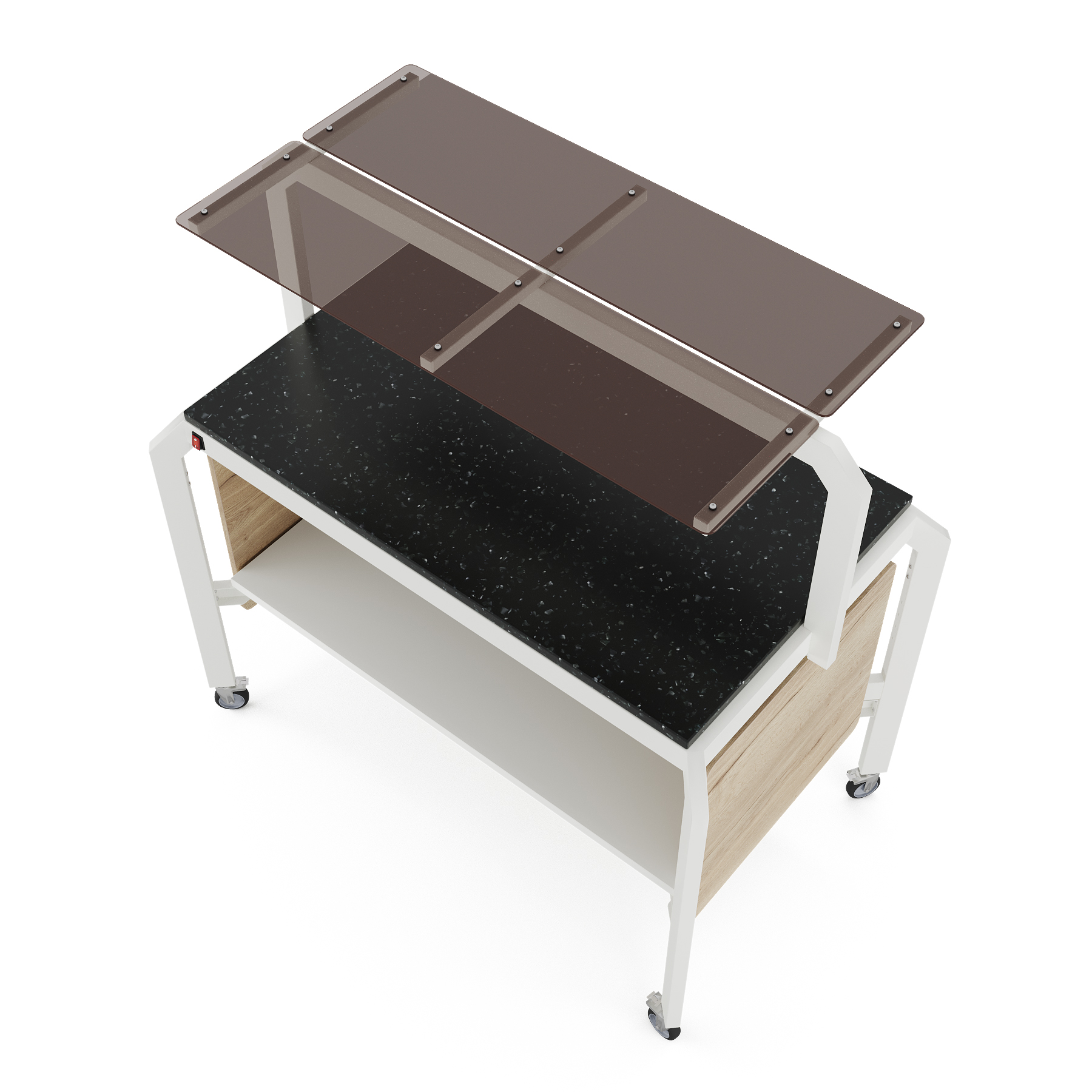 Модуль мобильный нейтральный КОБОР AN220 white/natural/coal предназначен для демонстрации, кратковременного хранения и раздачи готовых блюд: салатов, закусок, кондитерских изделий и напитков, и чистых тарелок в составе линий раздачи или самообслуживания в кафе, ресторанах и фудкортах, на предприятиях общественного питания и торговли. Модель оснащена полкой-надстройкой со стеклом и поворотными колесами для мобильности, 2 колеса оснащены тормозом. Сварной каркас выполнен из профиля сечением 60х30, покрытого порошковой краской, внешний корпус - из ЛДСП, столешница - из камня.