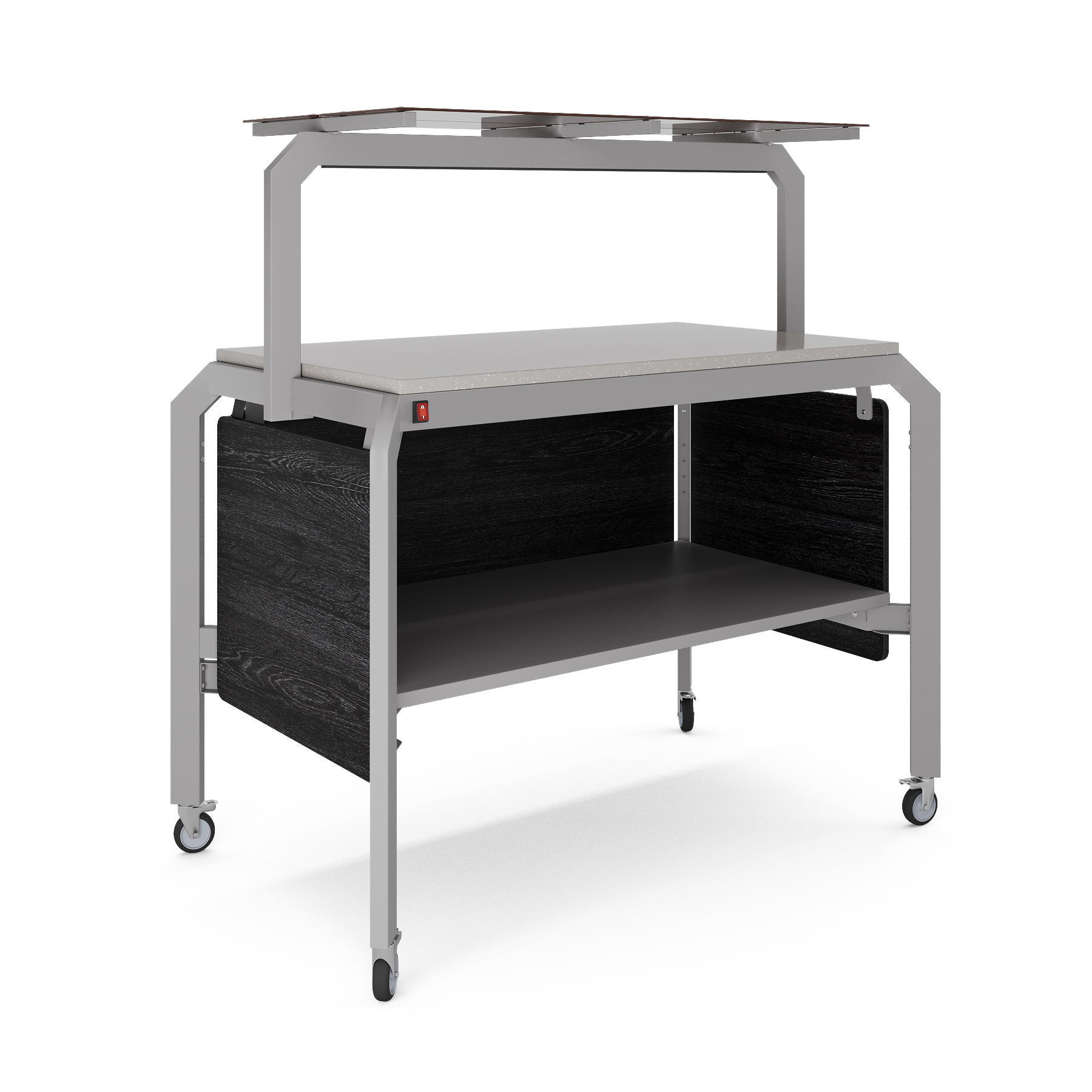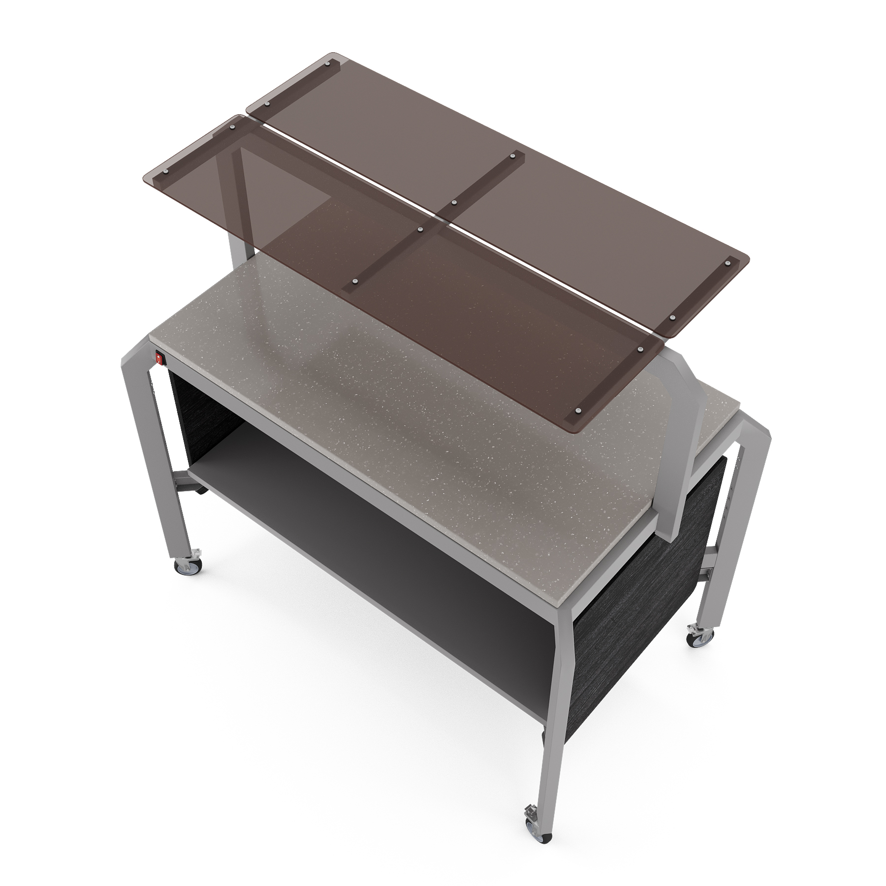 Модуль мобильный нейтральный КОБОР AN85 aluminum/glazed/sky предназначен для демонстрации, кратковременного хранения и раздачи готовых блюд: салатов, закусок, кондитерских изделий и напитков, и чистых тарелок в составе линий раздачи или самообслуживания в кафе, ресторанах и фудкортах, на предприятиях общественного питания и торговли. Модель оснащена полкой-надстройкой со стеклом и поворотными колесами для мобильности, 2 колеса оснащены тормозом. Сварной каркас выполнен из профиля сечением 60х30, покрытого порошковой краской, внешний корпус - из ЛДСП, столешница - из камня.