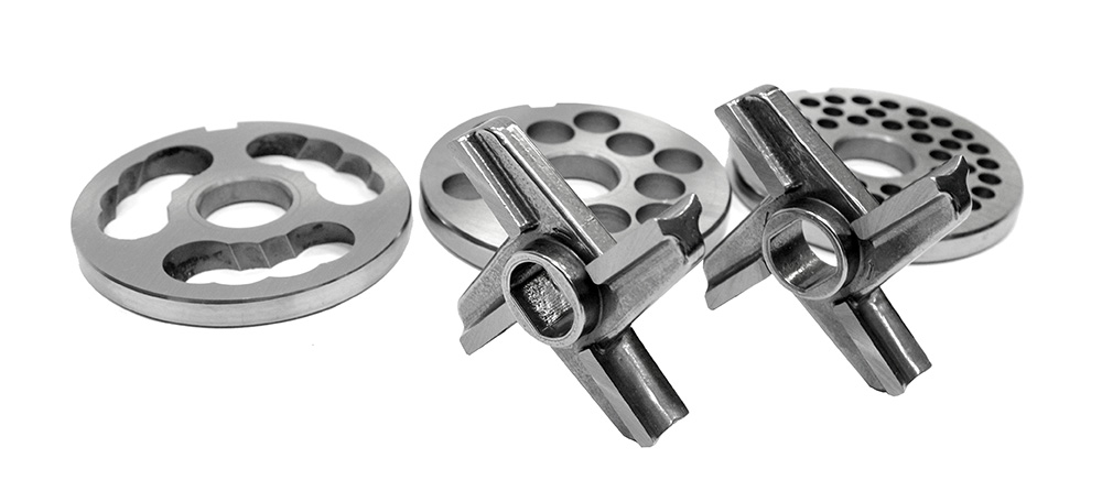 • Мясорубка - волчок электромеханическая с системой FULL-UNGER (последовательная установка подрезной решетки, двухстороннего ножа, промежуточной решетки, двухстороннего ножа, финальной решетки) с производительностью до 400 кг/ч.