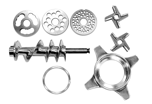 • Корпус настольной мясорубки из нержавеющей стали Aisi201, шнек и хобот из нержавеющей стали Aisi 202.