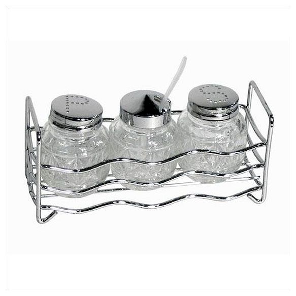 Набор предметов для специй, в который входит солонка, перечница, горчичница.