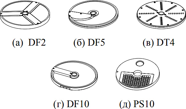 В комплект поставки входят лезвия для резки 2 и 5 мм, для шинковки 4 и 10 мм и для резки кубиками 10x10x10 мм.
