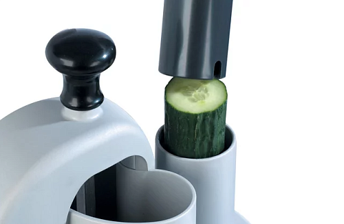 Модель оснащена 2 загрузочными отверстиями: большой D-образной воронкой для нарезки объёмных овощей и круглой - для длинных и нежных.