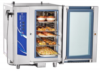 Пароконвектомат инжекторного типа отличается универсальностью применения, предназначен для тепловой обработки, сочетание пара и принудительной конвекции для приготовления разнообразных продуктов, а именно жарку, запекание, разогрев, пассировку, тушение, варку на пару и выпекание мучных изделий. При одновременном приготовлении различных блюд каждое из них сохраняет свой вкус и аромат, большинство витаминов и минеральных веществ. Внутрикамерная подсветка и дверь с двойным остеклением позволяет контролировать процесс, парогенератор для образования пара и легкосъемный жировой фильтр, душ для мойки, печь можно мыть изнутри под струей воды. Двухходовой механизм открывания духовки и вентилируемая дверь, предотвращает риск получения ожога рук с внешней стороны. Механизм замка двери действует по принципу "свободные руки" - для простого закрывания двери одним движением, обеспечивает безопасность персонала от воздействия горячего пара.