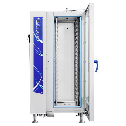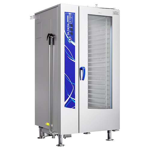 Внутренние и облицовочные поверхности пароконвектоматов изготовлены из высококачественной нержавеющей стали. Пароконвектомат оснащен закатной тележкой на 20 уровней GN1/1