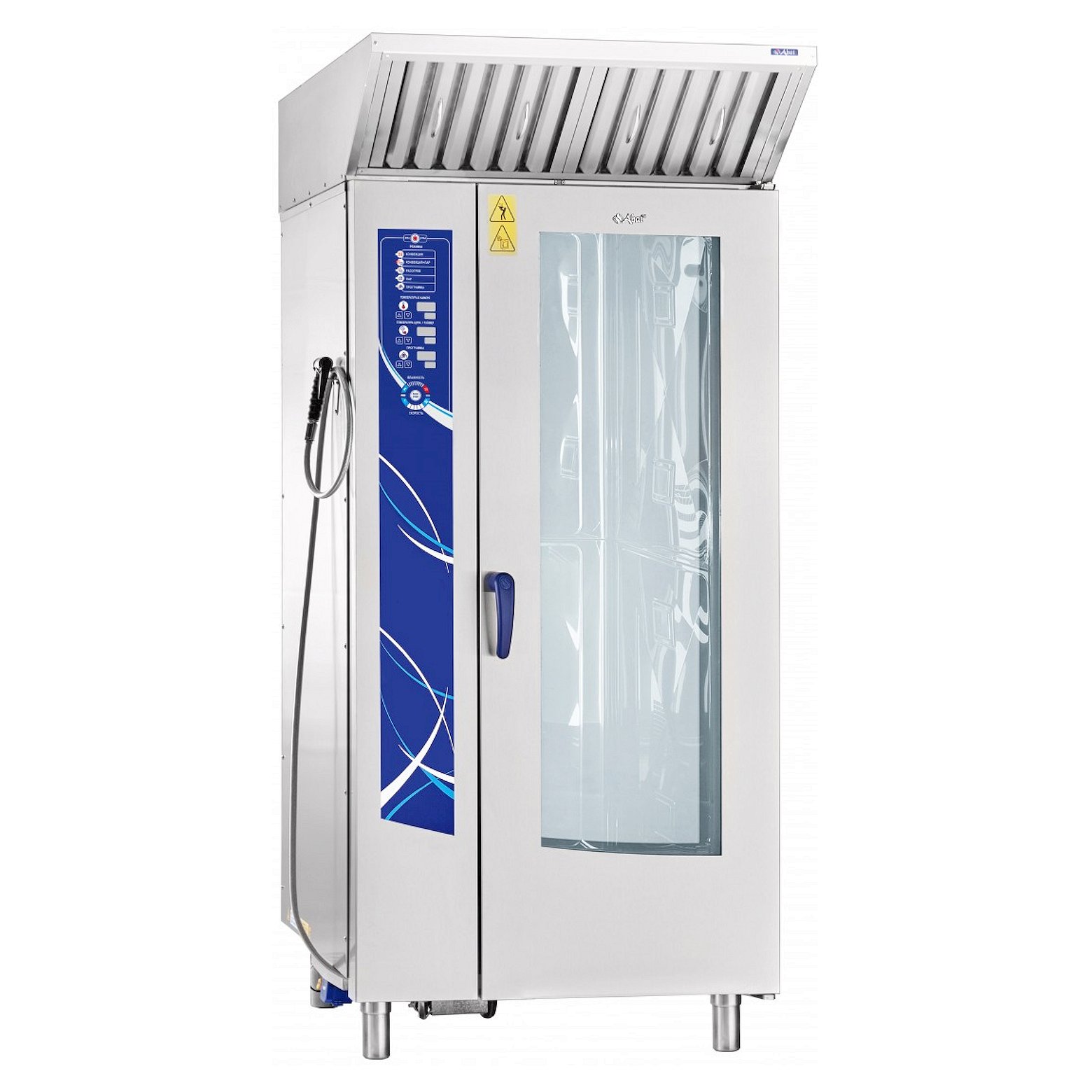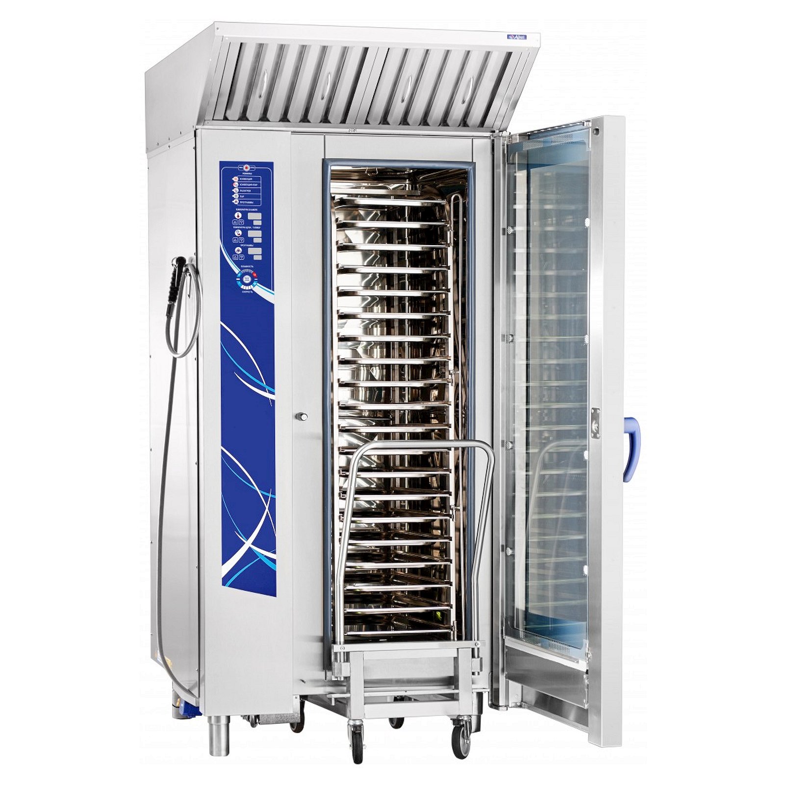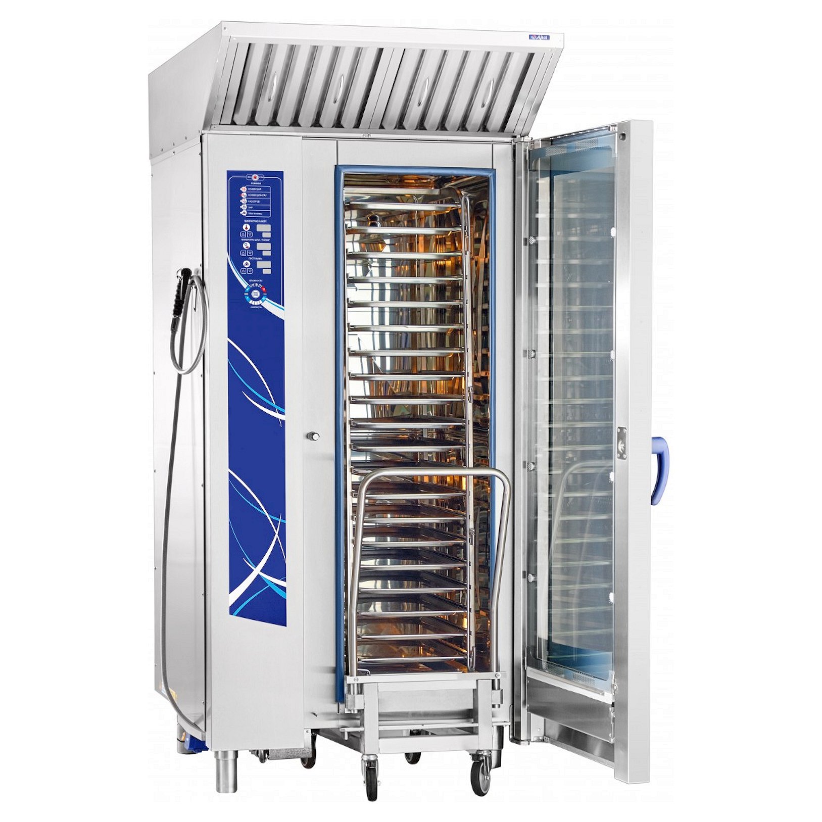 Внутрикамерная подсветка и дверь с двойным остеклением позволяет контролировать процесс, парогенератор для образования пара и легкосъемный жировой фильтр, душ для мойки, печь можно мыть изнутри под струей воды.