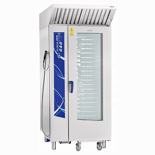 Двухходовой механизм открывания духовки и вентилируемая дверь, предотвращает риск получения ожога рук с внешней стороны. Механизм замка двери действует по принципу "свободные руки" - для простого закрывания двери одним движением, обеспечивает безопасность персонала от воздействия горячего пара.