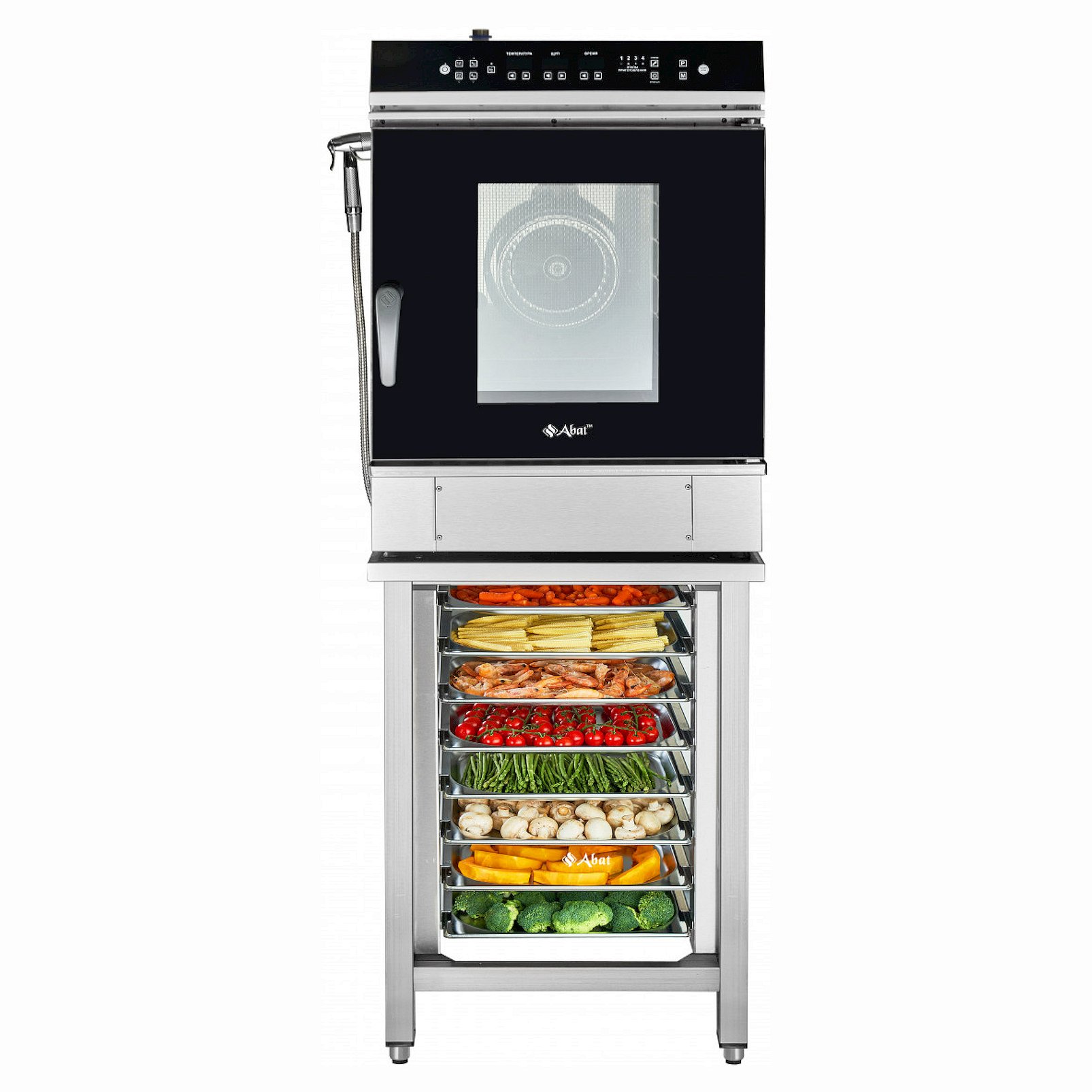 Пароконвектомат Abat ПКА 6-2/3П-01, верхняя панель управления, чёрн. дизайн, бойлерного типа с автоматической мойкой предназначен для приготовления различных блюд методом обработки паром и горячим воздухом по отдельности или комбинированно на предприятиях общественного питания. Модель оснащена ручным душем, удобной панелью управления с мембранной клавиатурой и внутренней подсветкой камеры.