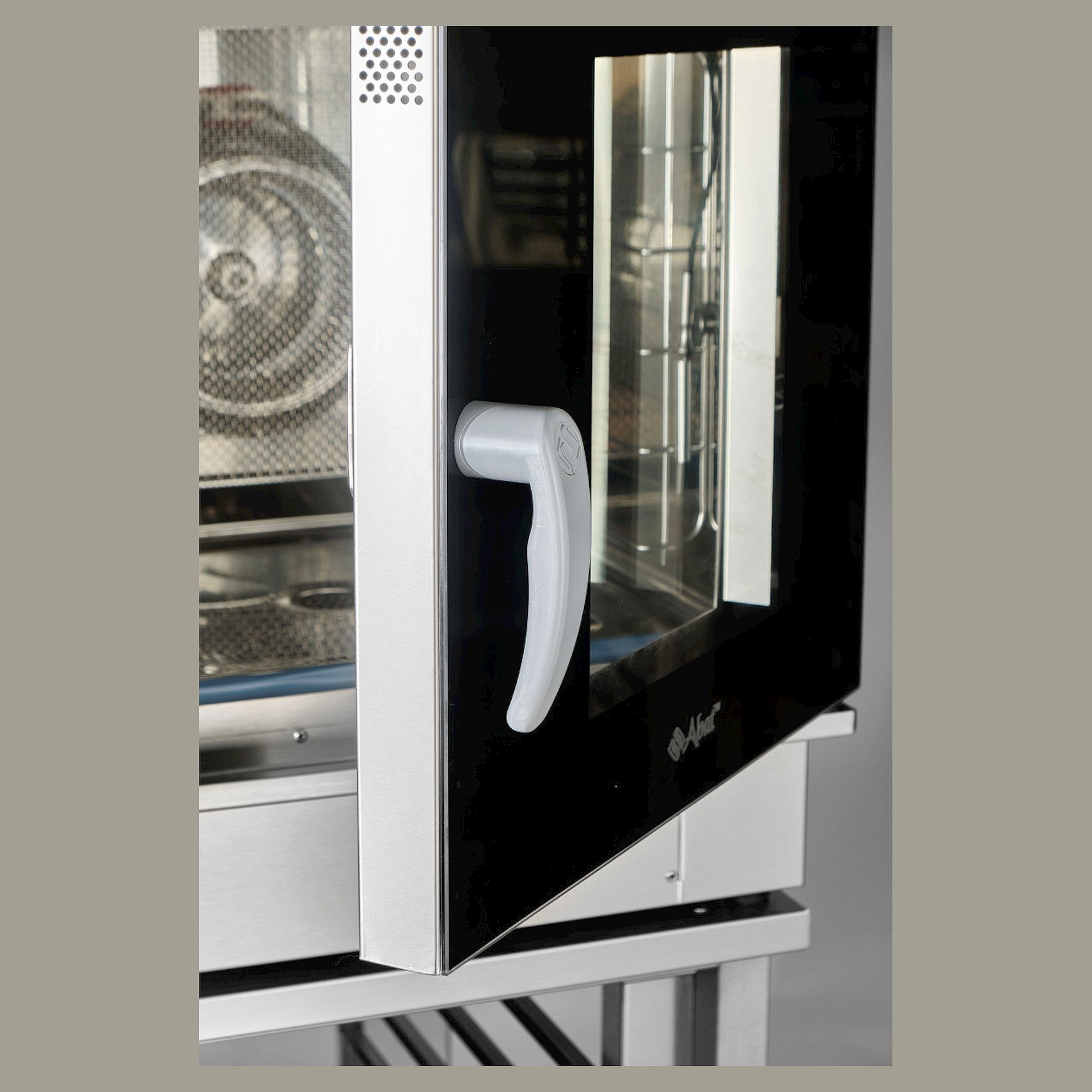 • Двухходовый механизм открывания дверцы духовки обеспечивает безопасность персонала от воздействия горячего пара