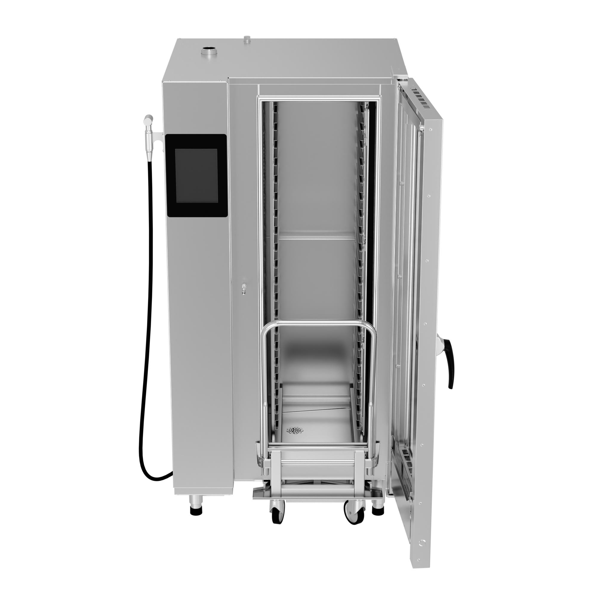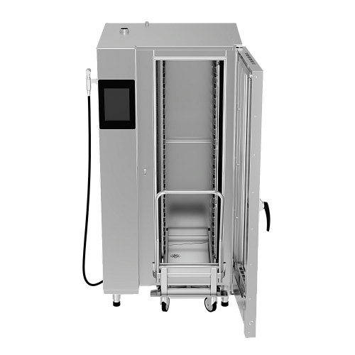 Через USB разъем можно обновлять программы электронной панели. Тройной стеклопакет дверцы обеспечивает снижение потерь тепла, наименьший нагрев внешних поверхностей. Дверной механизм имеет двухходовой замок для безопасности персонала от воздействия горячим паром.