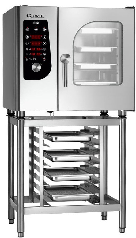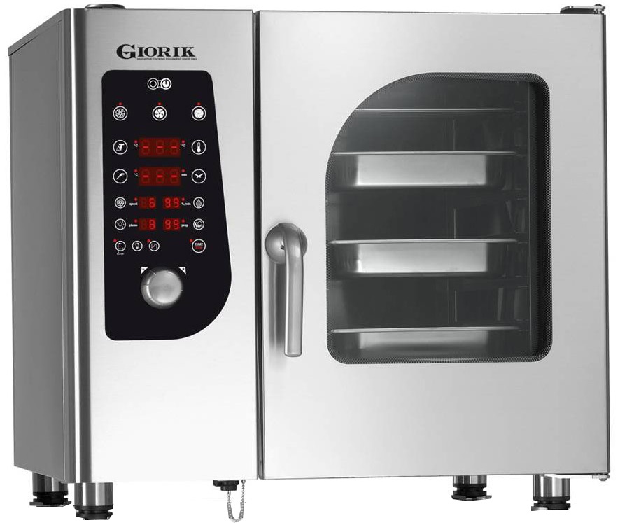 Пароконвектомат GIORIK SBME061 создан для применения в заведениях общепита. В комплект поставки не входят направляющие для противней. Один лишь этот аппарат с успехом заменит сразу несколько устройств на профессиональной кухне.