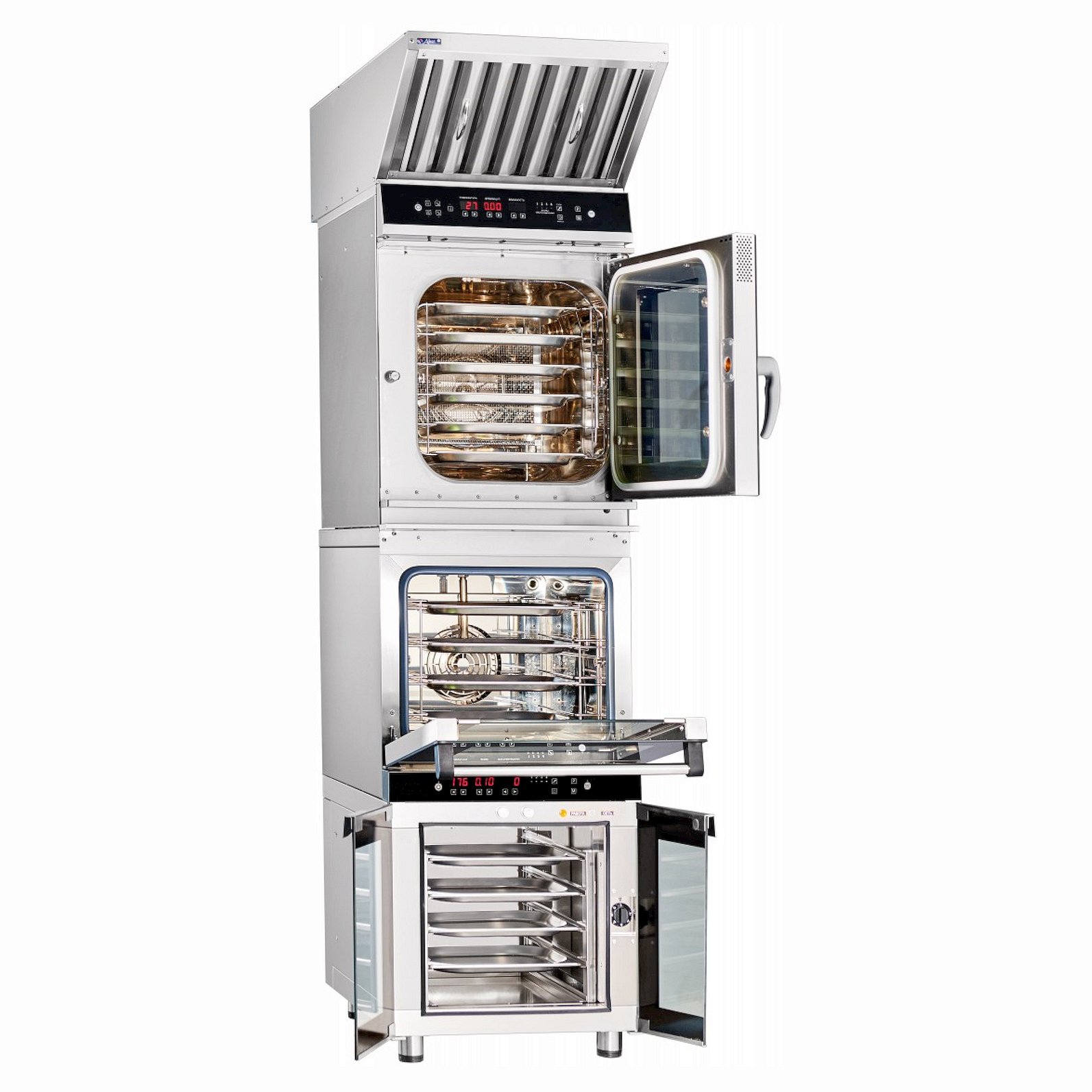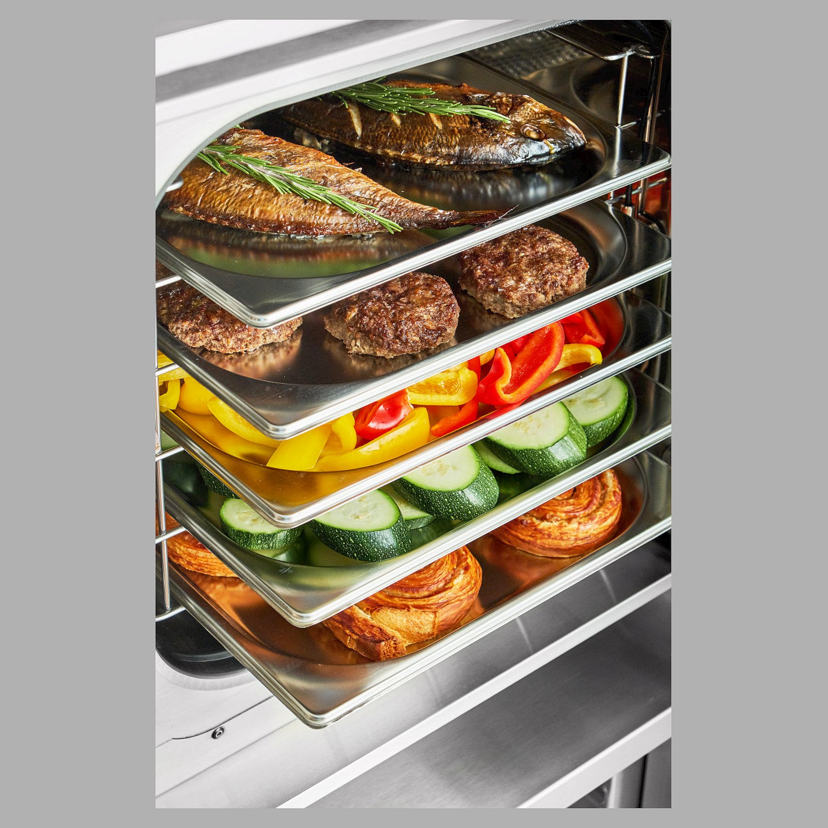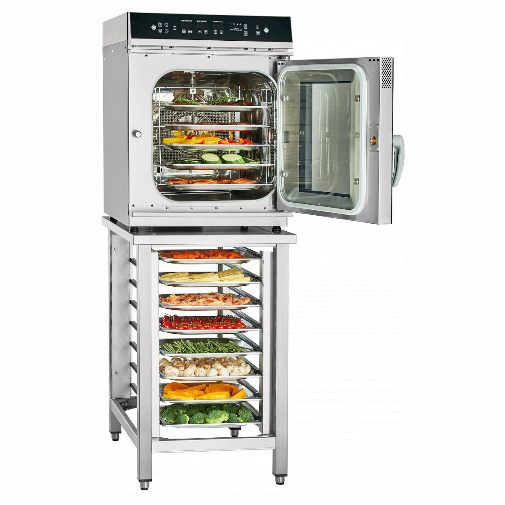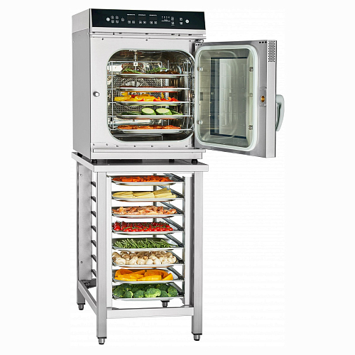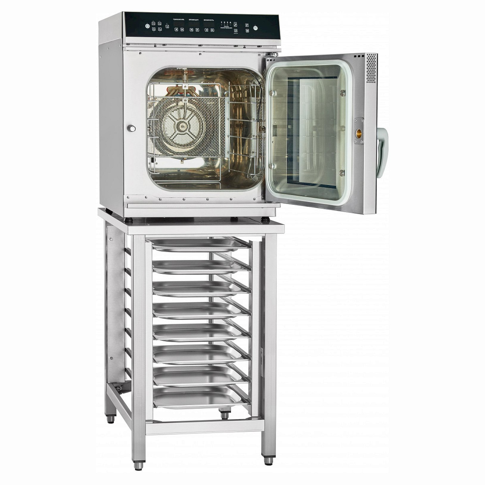 Внутрикамерная подсветка и дверь с двойным остеклением позволяет контролировать процесс приготовления блюд, удобная панель управления, камера со сглаженными углами для быстрого обслуживания, легкосъемный жировой фильтр. Двухходовой механизм открывания духовки и вентилируемая дверь, предотвращает риск получения ожога рук с внешней стороны. Механизм замка двери действует по принципу "свободные руки" - дверь можно закрывать одним движением руки, тем самым обеспечивая безопасность персонала от воздействия горячего пара. Модель компактного размера, что позволяет разместить в помещение с ограниченным пространством и установить на столе или подставке.