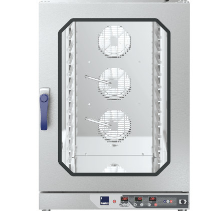 Профессиональная конвекционная духовка/пароконвектомат, оснащенная цифровой панелью управления, подсветкой, герметичной дверью с двойным остеклением из закаленного стекла. Система рециркуляции, необходимая для оптимального распределения воздуха внутри камеры, позволяет значительно снизить потребление энергии на подогрев.