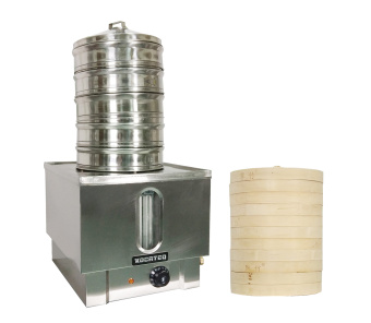 Пароварка настольная с круглыми деревянными корзинами Kocateq ES4WR используется на предприятиях общественного питания и торговли для приготовления на пару вегетарианского меню, мантов, вареников, баоцзов и другие традиционные блюда восточной кухни. Модель оснащена термостатом и цифровой панелью управления с сенсорными кнопками. Корпус выполнен из нержавеющей стали.