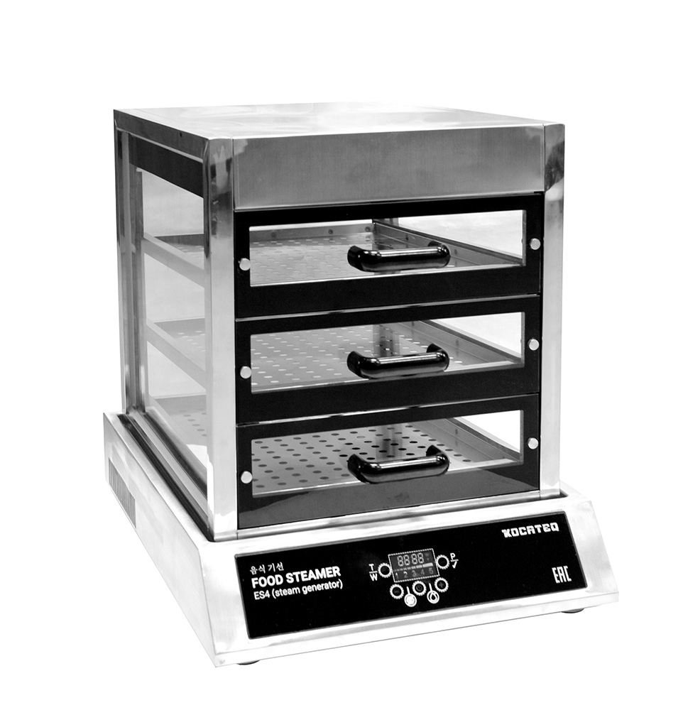 Пароварка настольная со стеклянной витриной с 4 уровнями Kocateq ES4G используется на предприятиях общественного питания и торговли для приготовления на пару вегетарианского меню, мантов, вареников, баоцзов и другие традиционные блюда восточной кухни. Модель оснащена 3-х уровневой стеклянной витриной, термостатом и цифровой панелью управления с сенсорными кнопками. Корпус выполнен из нержавеющей стали.