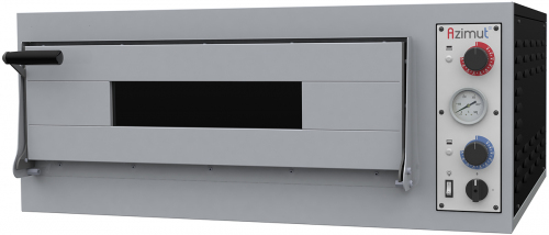 Печь для пиццы Azimut NEVO 4 однокамерная электрическая c электромеханическим управлением имеет подсветку, аналоговый термометр, независимое управление верхним и нижним ТЭНами, под камеры из огнеупорного камня, корпус из оцинкованной крашеной стали чёрного цвета, лицевую часть из нержавеющей стали.
