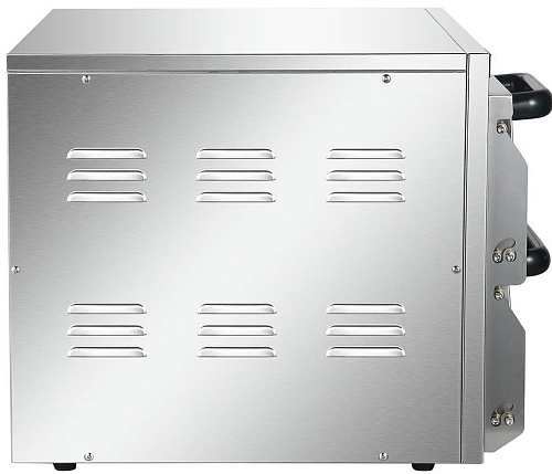 В конструкции предусмотрено две рабочие камеры. Нагрев осуществляется за счет ТЭНов с независимой регулировкой. Корпус печи выполнен из нержавеющей стали. На дверцах установлены смотровые окошки для контроля процесса приготовления.