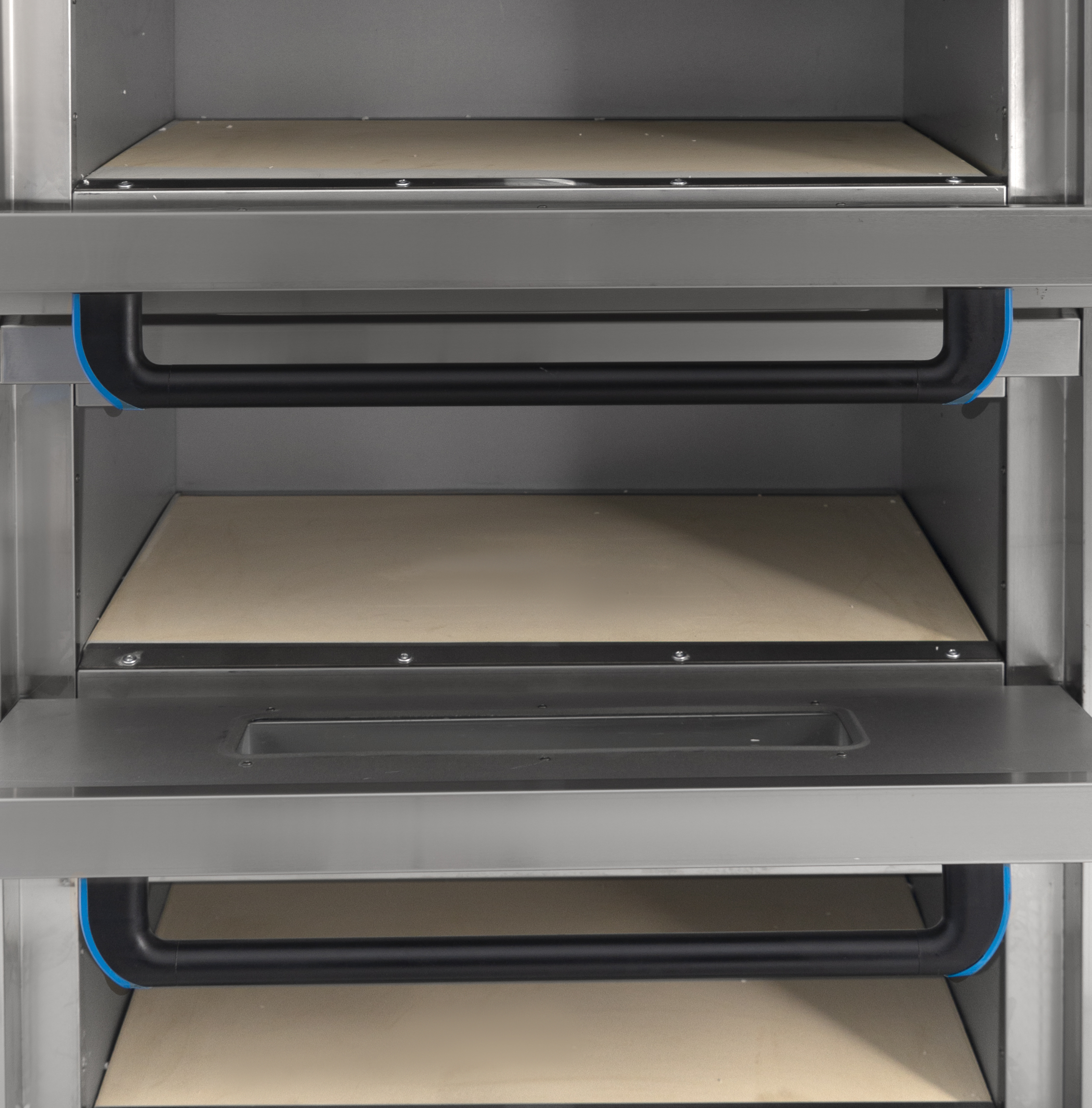 • высокие (180мм) пекарные камеры, позволяющие выпекать формовой хлеб, исключая подгорание верхней корки от контакта с верхней частью камеры (в отличии от пекарских шкафов)