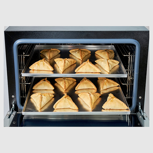 Камера и наружные поверхности выполнены из высококачественной нержавеющей стали. Используется противни размером 460х330, поставляются в комплекте. Рабочий диапазон температуры 20-270°С, установленный аварийный терморегулятор предохраняет печь от перегрева свыше 320°С. Скругленные углы камеры позволяют получить превосходный результат при приготовлении и после приготовления без проблем помыть духовку.