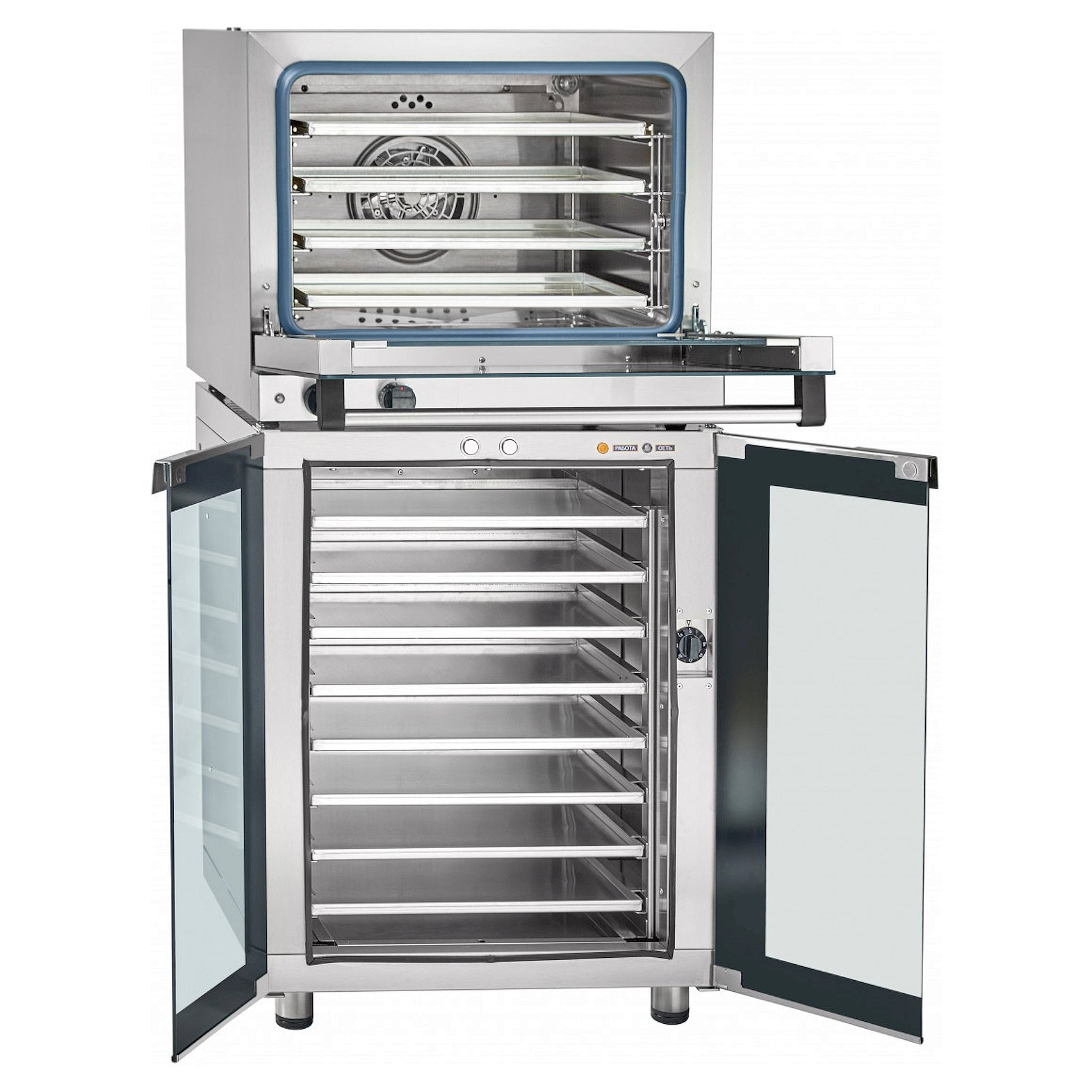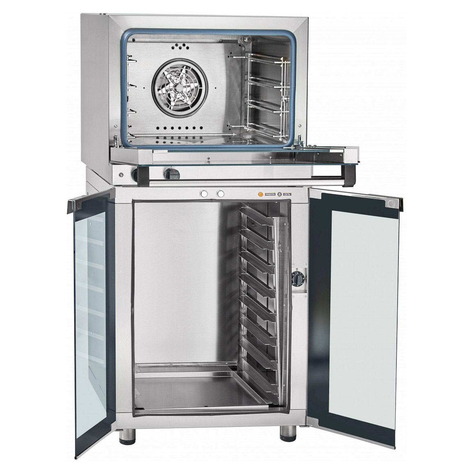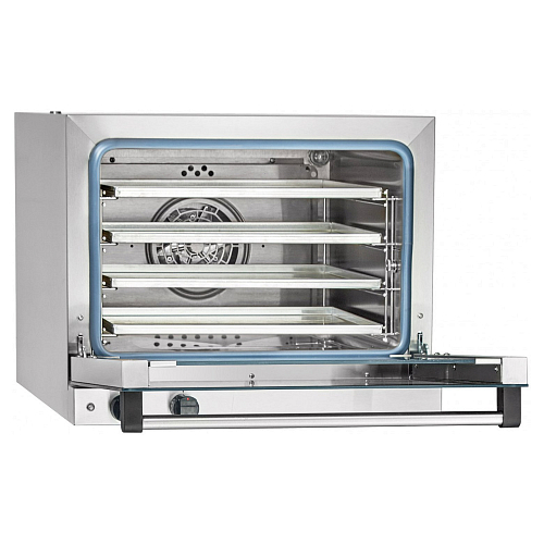 Камера и наружные поверхности выполнены из высококачественной нержавеющей стали. Используется противни размером 460х330, поставляются в комплекте. Рабочий диапазон температуры 20-270°С, установленный аварийный терморегулятор предохраняет печь от перегрева свыше 320°С. Скругленные углы камеры позволяют получить превосходный результат при приготовлении и после приготовления без проблем помыть духовку.