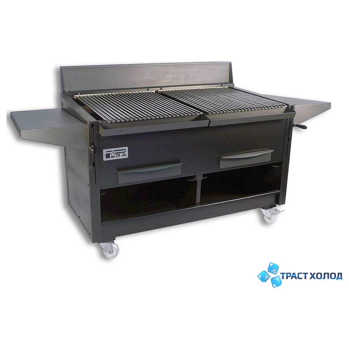 Гриль мангал PIRA BBQ-40 на твердом топливе рассчитан на 200 посадочных мест, с производительностью 80 кг в час, аппарат оборудован колесиками и может работать как в помещении, так и на улице.