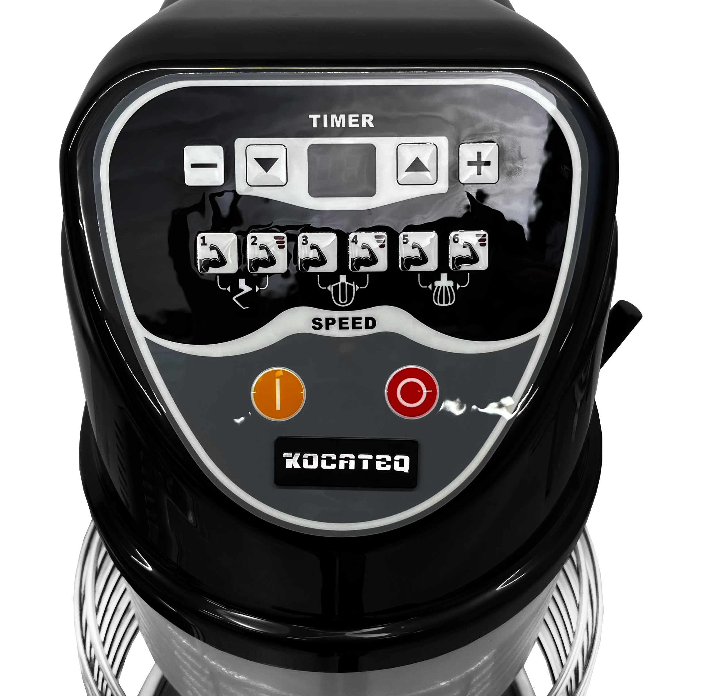 • Электронная панель управления с 6 скоростями, визуально разделенными для замеса крюком, лопаткой и венчиком.