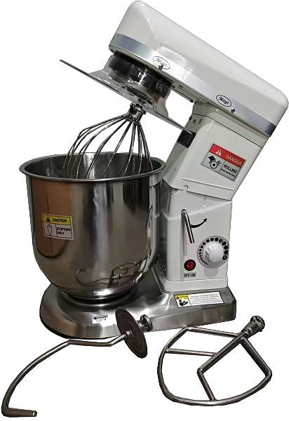 Миксер планетарный настольный профессиональный с 3 насадками: спиральный крюк, лопатка и венчик оснащён ручным подъемом дежи, пластиковой защитой, ножками, бесступенчатой регулировкой скорости (0-302 об/мин) и (0-1000 об/мин), белым корпусом.