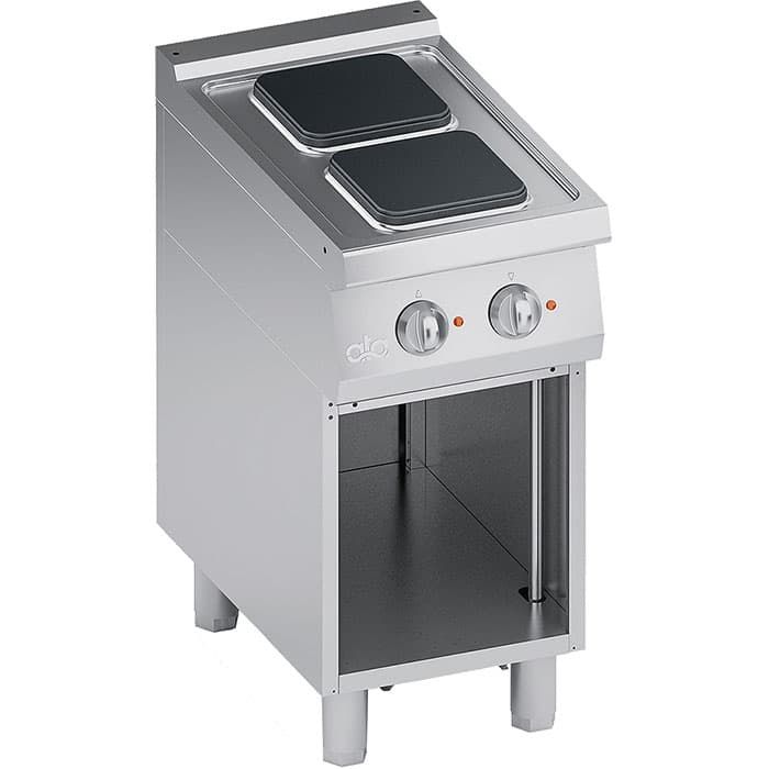 Модель оснащена температурными датчиками внутри конфорок, обеспечивающими безопасность работы и регулируемыми по высоте ножками. Корпус и ножки выполнены из нержавеющей стали, рабочая поверхность и передняя панель - из нержавеющей стали AISI 304, атермические ручки - из пластика с трафаретной печатью по краям, квадратные конфорки - из чугуна.