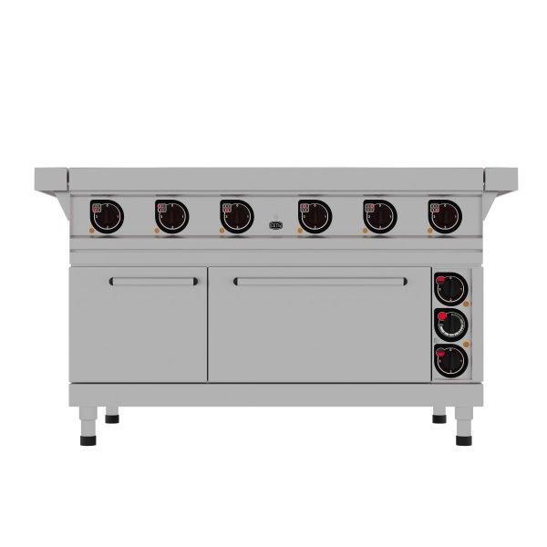 Комплектуется шестью чугунными конфорками с двумя ТЭНами в каждой, которые обеспечивают быстрый, равномерный нагрев и длительный срок эксплуатации конфорок. Плита имеет поддон для сбора жидкости. Конструкция плиты предусматривает съемные боковые полочки, которые позволяют уменьшить размеры плиты. Регулируемые ножки каркаса компенсируют неровности пола в пределах 20 мм Плита комплектуется противнями. Жарочный шкаф оснащен верхним и нижним ТЭНами с раздельной регулировкой температуры.