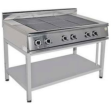 Плита электрическая RADA ПЭ-726О является моделью напольного типа. Плита на открытой подставке предназначена для приготовления горячих блюд  в кафе, ресторанах и местах общественного питания.  Модель оснащена 6-ю конфорками, которые образуют одну сплошную поверхность. Корпус - нержавеющая сталь. Панель управления – электромеханическая, расположенная под рабочей поверхностью. Блокирующие термостаты обеспечивают безопасность эксплуатации. Под рабочей поверхностью имеется просторная полка для хранения кухонной утвари.  Модель оборудована поддоном для слива жидкости. Время нагрева конфорок 25 минут. Максимальная температура нагрева конфорок  400С.