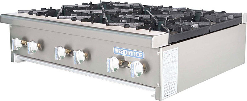 Плита газовая, промышленная, модельный ряд "RADIANCE". Предназначена для общепита. 6 газовых конфорок, без духовки, без гриля. Материал накладок и решеток - чугун. Материал корпуса - нерж. сталь. Размеры 914x762x305. Вес – 109 кг