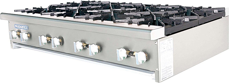 Плита газовая, промышленная, модельный ряд "RADIANCE". Предназначена для общепита. 8 газовых конфорок. Материал накладок и решеток - чугун. Материал корпуса - нерж. сталь.