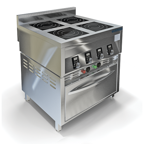 Индукционная плита на 4 конфорки признана оптимальным оборудованием, предназначенным для кухонь заведений общественного питания. Изделие работает на основе использования электромагнитного поля. Благодаря медной катушке и высокочастотному электрическому току (вихревым токам), тепло интенсивно возникает в диске дна посуды и от дна нагревает пищу. Электрическая четырехконфорочная плита практически мгновенно разогревает кастрюлю и находящиеся в ней продукты, поэтому ее КПД равен 90%!