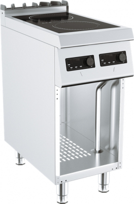 Плита индукционная Epicur-Kusina G7IN100E-W используется в составе тепловой линии 700 для приготовления различных блюд в наплитной посуде на предприятиях общественного питания и торговли. Плита электрическая индукционная напольная, на полузакрытом стенде без двери (открытом со стороны оператора), оснащена сплошной поверхностью с 2 конфорками мощностью 2х3500Вт. Каждая конфорка имеет независимый терморегулятор, внутреннюю термическую защиту от перегрева: если зона пуста, её нагрев уменьшится автоматически. Модуль оснащён 4 регулируемыми по высоте ножками из нержавеющей стали. Оборудование изготовлено из нержавеющей стали и относится к 700 линии приготовления.