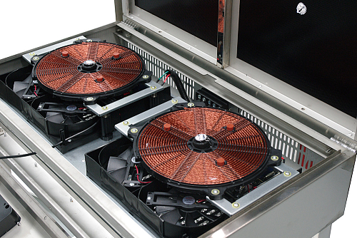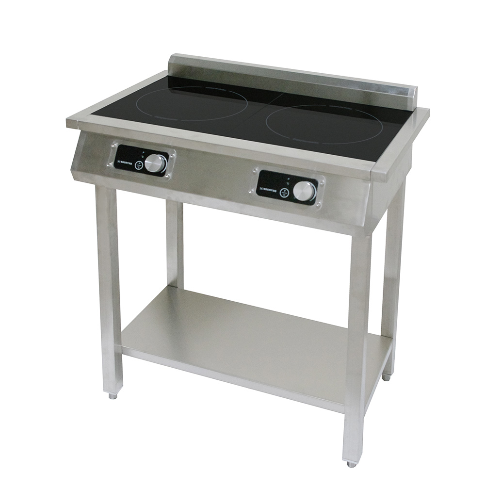 Плита имеет 2 зоны нагрева мощностью 3,5 кВт каждая, размер конфорок 360x380 мм с максимальной нагрузкой на каждую зону до 30 кг. Модель с пристенным бортом, устанавливается в плотную к стене с дополнительной фиксацией в верхней части задней пары опор через предусмотренные отверстия.