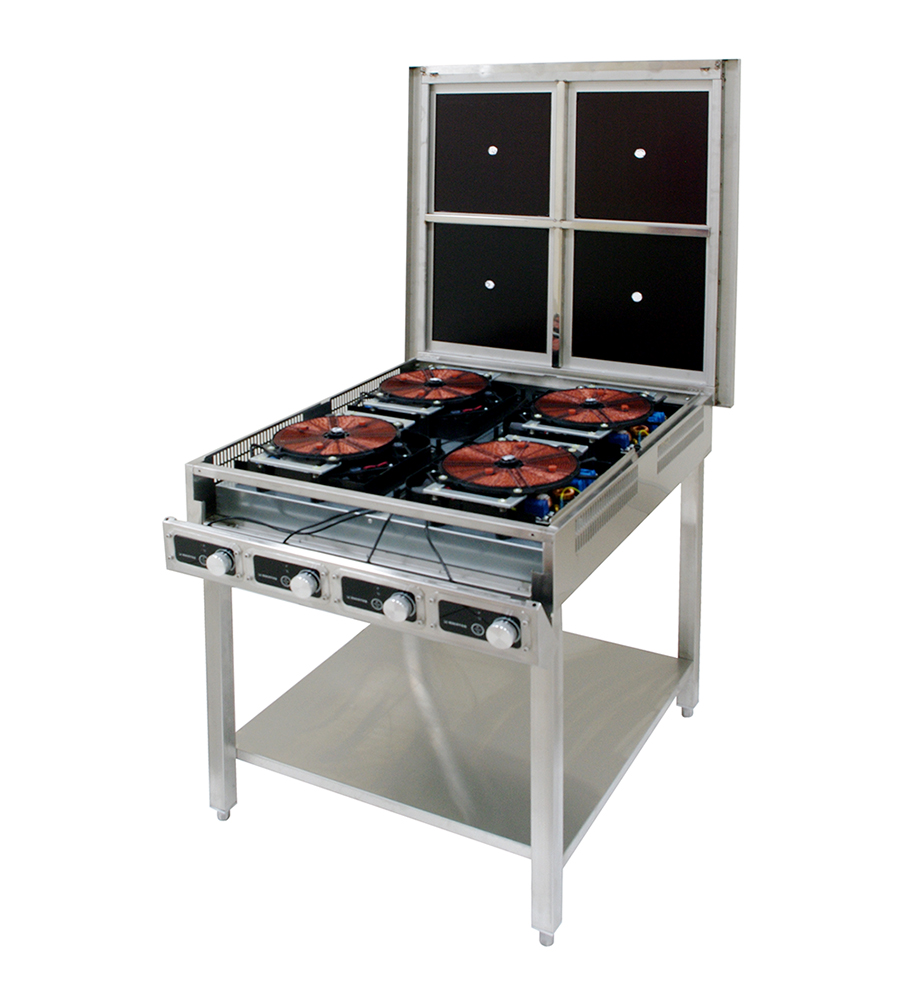 Плита имеет 4 зоны нагрева мощностью 3,5 кВт каждая, размер конфорок 360x380 мм с максимальной нагрузкой на каждую зону до 30 кг. Модель с пристенным бортом, устанавливается в плотную к стене с дополнительной фиксацией в верхней части задней пары опор через предусмотренные отверстия.