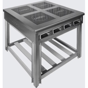 Плита индукционная OBOD ПЭИ-4 настольная с 4 стеклокерамическими поверхностями, круглыми конфорками диаметром 300мм, мощностью 4х3500Вт оснащена защитой от перегрева, корпусом из нержавеющей стали. Рабочая температура: +80...+280С. Модель оснащена цифровой панелью управления, 4 активными джойстиками, 6 уровнями мощности. Четыре отдельные конфорки могут быть настроены независимо для точного контроля температуры и приготовления различных блюд одновременно. Каждая конфорка оснащена 2-мя кулерами охлаждения, что предотвращает перегрев конфорки. Для индукционной плиты подходит только специльная посуда. Плита работает по принципу вихревых токов, что позволяет максимально экономить электроэнергию, а также в разы ускоряет процесс готовки. Благодаря инновационной технологии, эта плита мгновенно нагревает посуду, существенно сокращая время приготовления. Плита также обеспечивают высокую степень безопасности. Поверхность плиты не нагревается, поэтому риск обжечься или случайно включить плиту минимален. Разборный стенд оснащён полкой-решёткой.