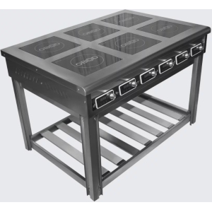 Плита индукционная OBOD ПЭИ-6 настольная с 6 стеклокерамическими поверхностями, круглыми конфорками диаметром 300мм, мощностью 6х3500Вт оснащена защитой от перегрева, корпусом из нержавеющей стали. Рабочая температура: +80...+280С. Модель оснащена цифровой панелью управления, 6 активными джойстиками, 6 уровнями мощности. Шесть отдельных конфорок могут быть настроены независимо для точного контроля температуры и приготовления различных блюд одновременно. Каждая конфорка оснащена 2-мя кулерами охлаждения, что предотвращает перегрев конфорки. Для индукционной плиты подходит только специльная посуда. Плита работает по принципу вихревых токов, что позволяет максимально экономить электроэнергию, а также в разы ускоряет процесс готовки. Благодаря инновационной технологии, эта плита мгновенно нагревает посуду, существенно сокращая время приготовления. Плита также обеспечивают высокую степень безопасности. Поверхность плиты не нагревается, поэтому риск обжечься или случайно включить плиту минимален. Разборный стенд оснащён полкой-решёткой.