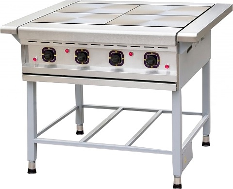 Плита Онега ПЭ - 4конф. (без ж/ш) Нов. предназначена для приготовления широкого ассортимента блюд в наплитной посуде в кафе, ресторанах и на других предприятиях общественного питания и торговли. Модель оснащена рабочей поверхностью с 4 варочными зонами, открытой подставкой и фронтальной электромеханической панелью управления. Лицевые элементы корпуса выполнены из нержавеющей стали, задняя стенка – из оцинкованной стали, подставка – из стали с антикоррозийным покрытием, рабочая поверхность – из чугуна.