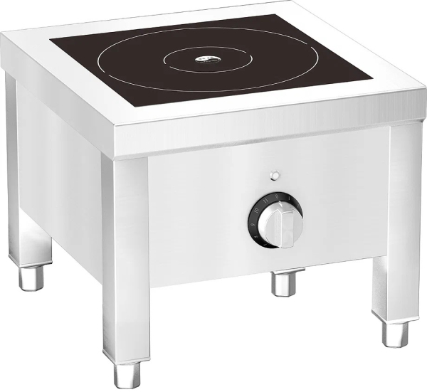 Плита-табурет индукционная INDOKOR IN5000T-PRO со стеклокерамической поверхностью 340х340мм с 1 конфоркой, с электромеханическим управлением, датчиком наличия посуды изготовлена из нержавеющей стали (днище - из оцинкованной стали). Плита имеет 11 уровней мощности (500-5000Вт). Плита автоматически отключается при снятии посуды. Максимальная нагрузка на поверхность - до 40кг. Рабочая температура: +60/+240С. Для индукционных плит используется специальная посуда, дно которой имеет слой ферромагнитного металла. Без стоящей на ней посуды плита нагреваться не будет, что значительно экономит потреблении энергии и обезопасит от ожогов. Плита предназначена для использования с большими индукционными кастрюлями и котлами.