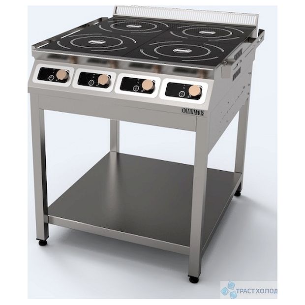 Корпус плиты электрической индукционной Dominator ПЭИ-4 D (4 конфорки) выполнен полностью из нерж. cтали марки AISI 430 толщиной 1,2мм. Каркас разборный выполнен из профильных элементов нержавеющей стали марки AISI 430 толщиной 1,2 мм., ножки  из нержавеющей трубы 40х40 марки AISI 430.