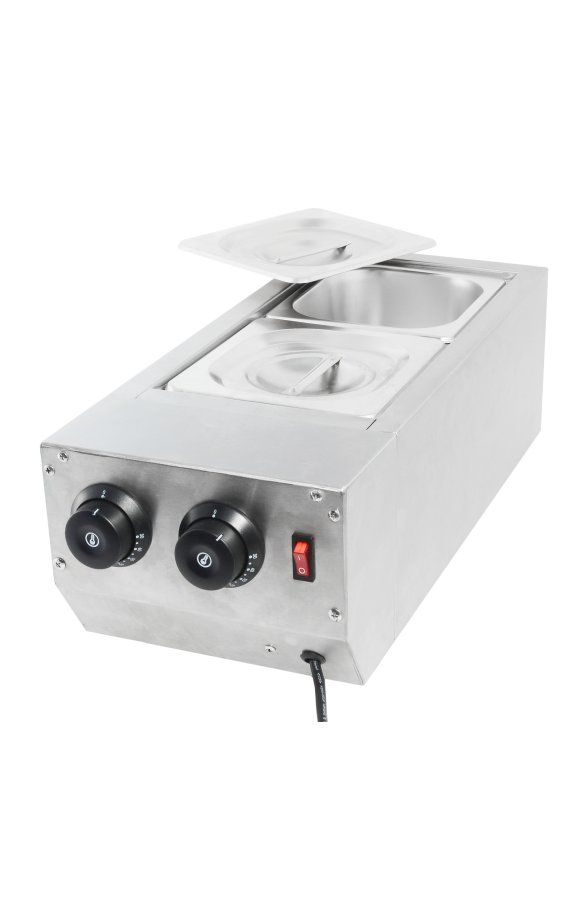 Модель оснащена 2 емкостями для работы с различными видами шоколада одновременно и 2 термостами независимой регулировки температуры. Корпус выполнен из нержавеющей стали.