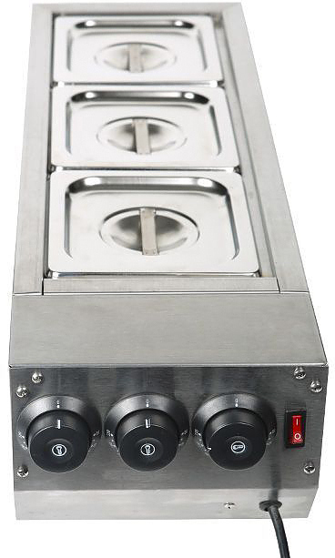 Подогреватель для шоколада Rosso HW-23 (3-ёмкостной) используется на предприятиях общественного питания и торговли для темперирования и поддержания в горячем виде шоколада и соусов. Модель оснащена 3 емкостями для работы с различными видами шоколада одновременно, 3 ТЭНами, 3 термостами независимой регулировки температуры и керамическими подогревателями. Корпус выполнен из нержавеющей стали. В комплект поставки входят 3 GN 1/6 глубиной 100 мм с крышками. Температурный режим: 30-110°C.