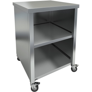Модель оснащена сплошной столешницей и четырьмя поворотными колесами. Стол выполнен из нержавеющей стали.