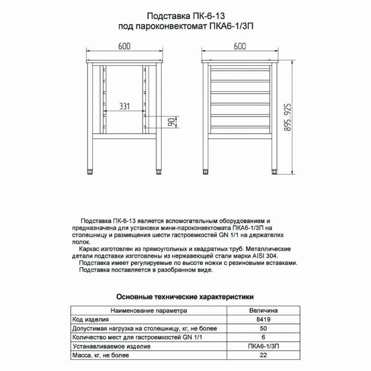 Конструкция подставки ПК-6-13 имеет 6 пар направляющих под гастроемкости GN1/1. На нее можно установить до 18 гастроемкостей. Подставка полностью выполнена из высококачественной нержавеющей стали, устойчивой к коррозии. Ножки подставки можно регулировать по высоте.