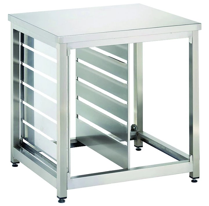 Подставка под пароконвектомат открытая с 10 парами направляющих (2 секции по 5 пар) для размещения гастроёмкостей GN1/1, разборным каркасом из трубы 40х40мм, обвязкой с 4-х сторон, 4 ножками изготовлена из нержавеющей стали AISI 430.