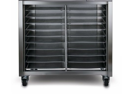 Подставка представляет собой открытый стенд, выполненный из нержавеющей стали и установленный на колеса. В сборный каркас изделия встраиваются направляющие для размещения 5-и противней размером 800х600 мм или 10-и размером 600х400 мм.