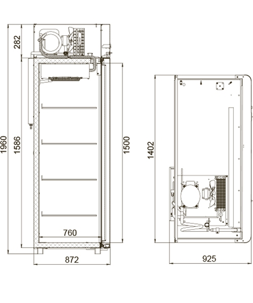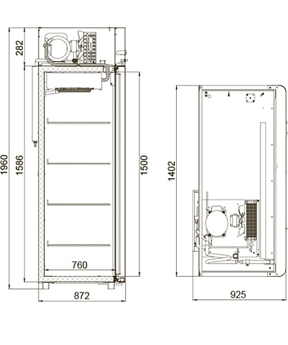 Имеет цельнозаливной пенополиуретановый корпус без щелей и стыков, гарантирующий надежную термоизоляцию охлаждаемого пространства, механическую прочность и долговечность шкафа.